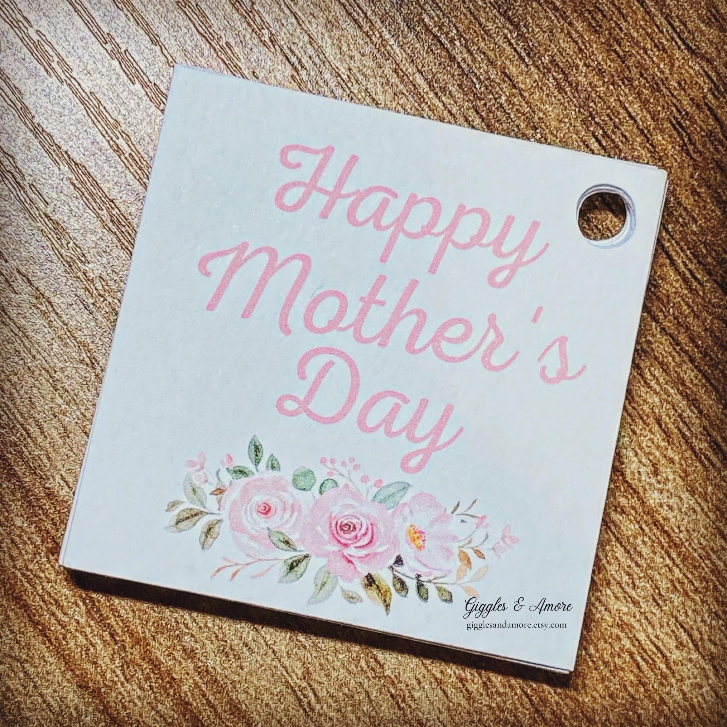 10 Happy Mother's Day tags with hole.Each tag is 40 x 40mm (4 x 4cm) in size and made on 200gsm card.Dispatched with FREE Royal Mail 2nd Class postage.