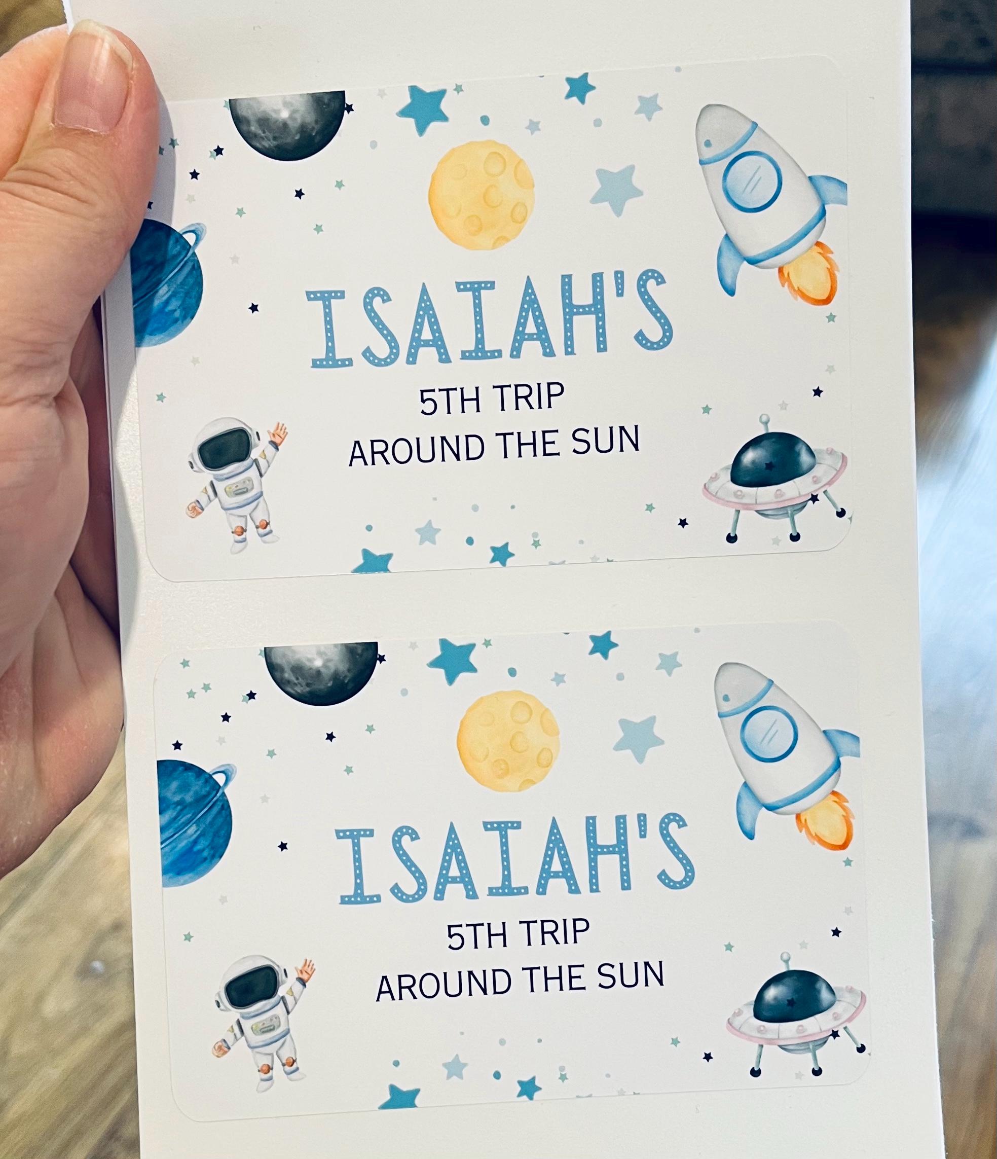 Personalised Party Stickers in a space, first trip around the sun theme.
