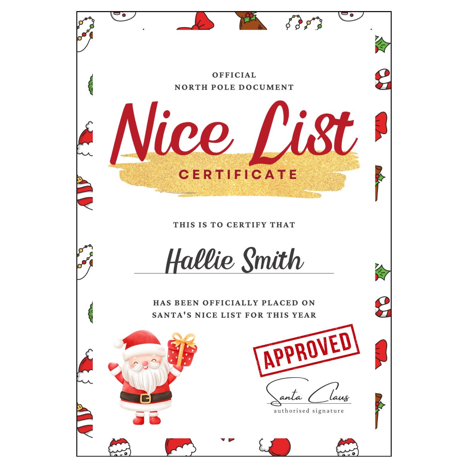 Personalised Letter From Santa, Nice List Certificate, Christmas Eve Box Filler.